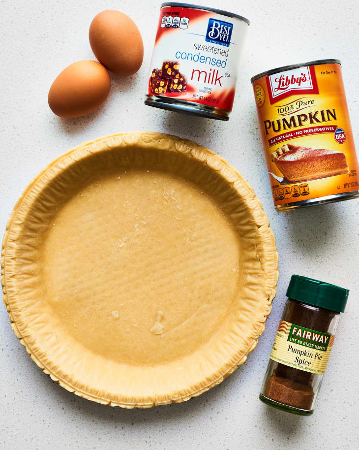 Just pour the pumpkin pie filling into an unbaked chilled or frozen pie crust, and bake it in the oven.